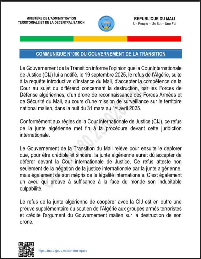 COMMUNIQUE N°080 DU GOUVERNEMENT DE LA TRANSITION