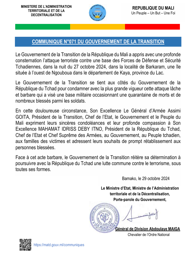 COMMUNIQUE N071 DU GOUVERNEMENT DU MALI_ATTAQUE CONTRE BASE MILITAIRE TCHAD-1