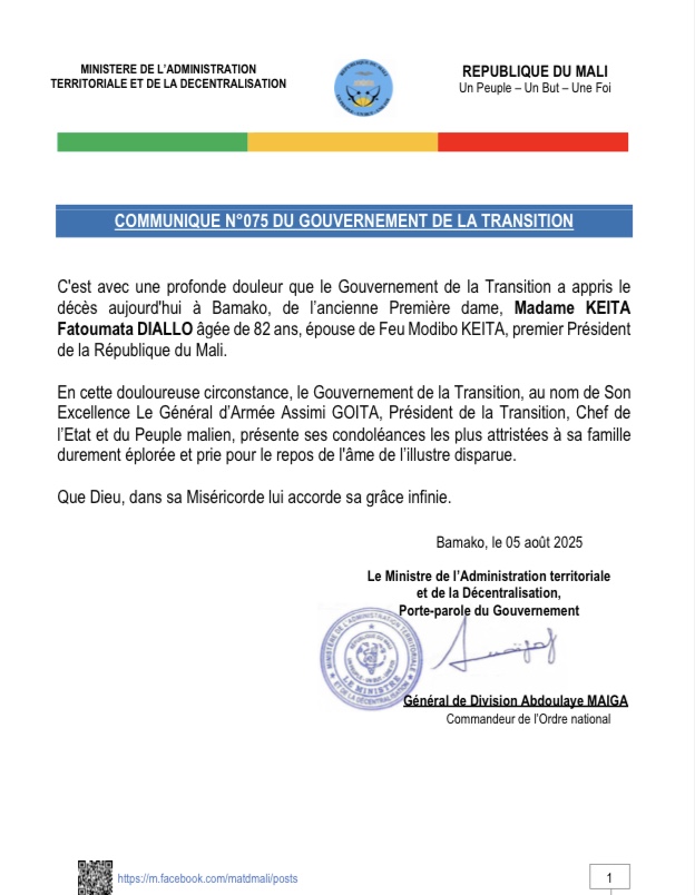 COMMUNIQUE N°075 DU GOUVERNEMENT DE LA TRANSITION