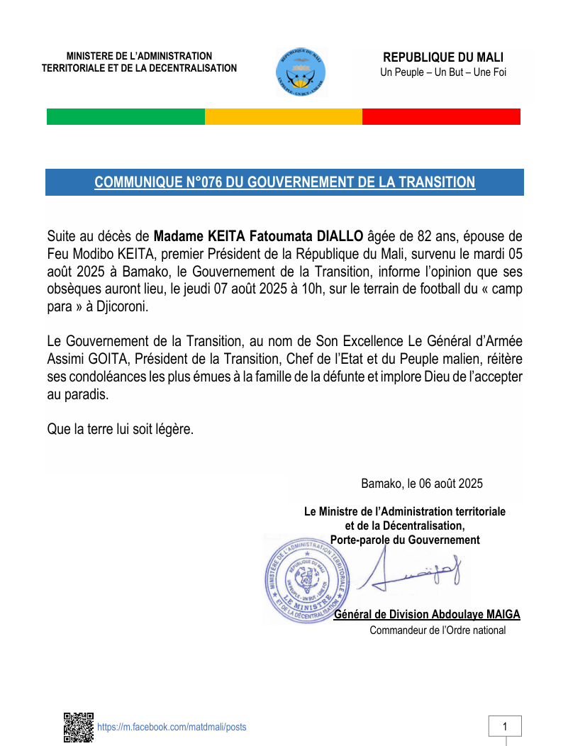 COMMUNIQUE N°076 DU GOUVERNEMENT DE LA TRANSITION