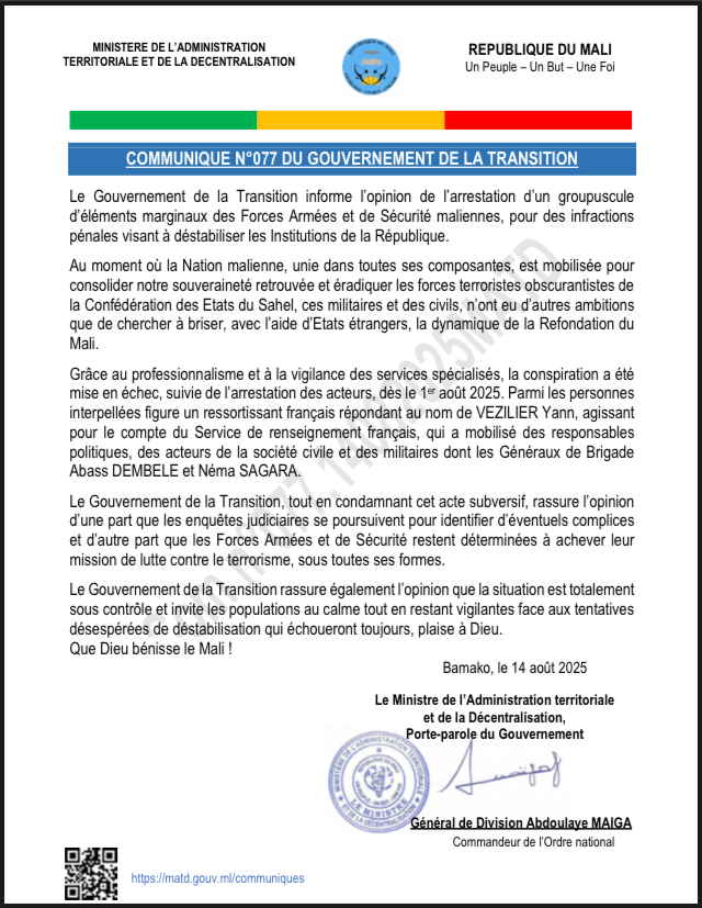COMMUNIQUE N°077 DU GOUVERNEMENT DE LA TRANSITION